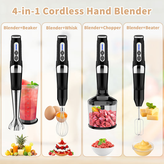 [US Stock]Cordless Immersion Blender 4-in-1 Rechargeable Electric Hand Blender, 21-Speeds & 3-Angle Adjustable with Chopper, 700ml Beaker, Egg Whisk and Beater