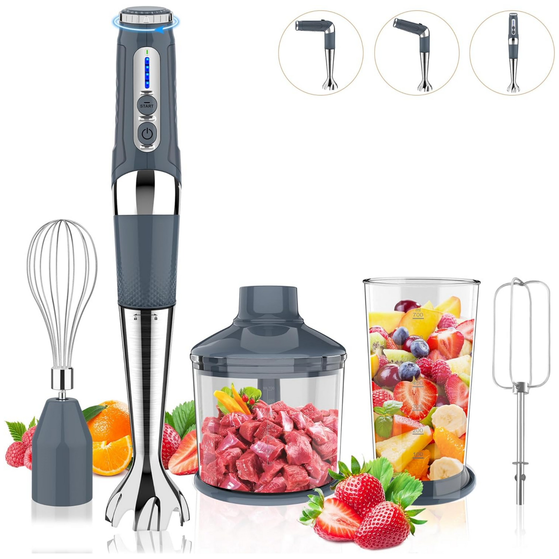 [US Stock]Cordless Immersion Blender 4-in-1 Rechargeable Electric Hand Blender, 21-Speeds & 3-Angle Adjustable with Chopper, 700ml Beaker, Egg Whisk and Beater